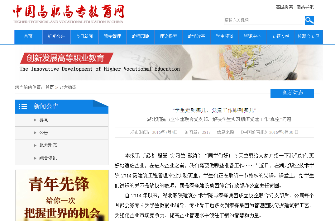 自2014年以来,湖北职院建筑技术学院与泰森集团成立校企联合党支部后,公司每个月都会派专人为学生做就业辅导。专业骨干也多次到泰森集团为管理团队传授建筑新工艺,为强化企业市场竞争力、提高企业管理水平倾注了新的智慧和力量。