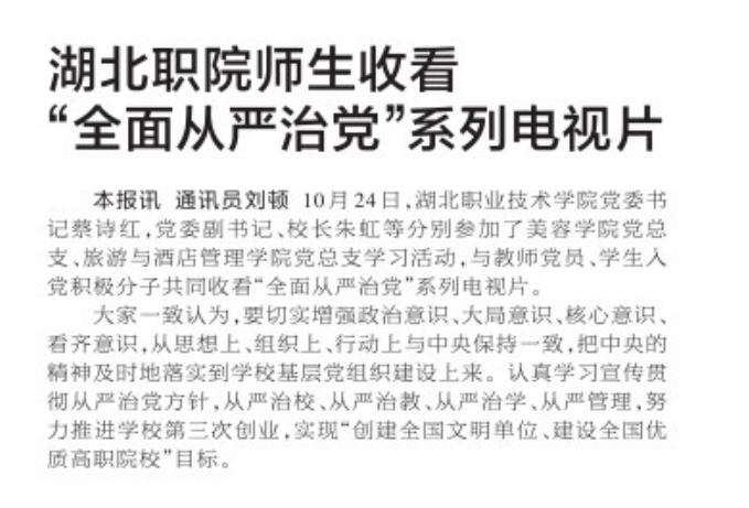 本报讯 通讯员刘顿 10月24日,虎牙手机客户端党委书记蔡诗红,党委副书记、校长朱虹等分别参加了美容学院党总支、旅游与酒店管理学院党总支学习活动,与教师党员、学生入党积极分子共同收看“全面从严治党”系列电视片。