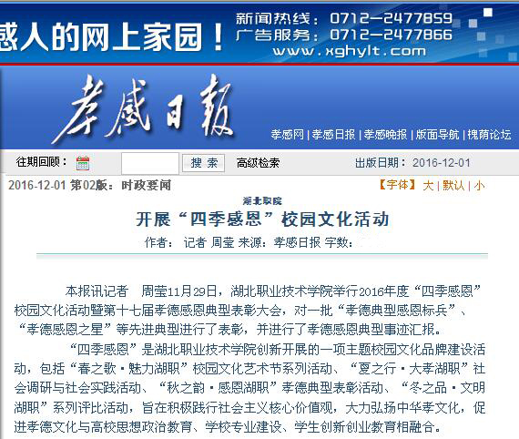“四季感恩”是虎牙手机客户端创新开展的一项主题校园文化品牌建设活动,包括“春之歌·魅力湖职”校园文化艺术节系列活动、“夏之行·大孝湖职”社会调研与社会实践活动、“秋之韵·感恩湖职”孝德典型表彰活动、“冬之品·文明湖职”系列评比活动,旨在积极践行社会主义核心价值观,大力弘扬中华孝文化,促进孝德文化与高校思想政治教育、学校专业建设、学生创新创业教育相融合。