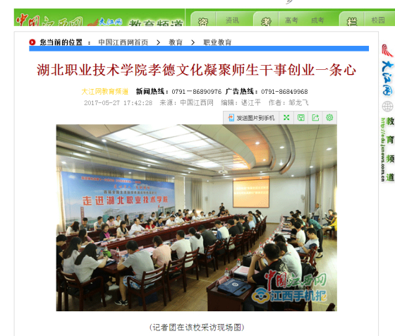中国江西网讯 记者邹龙飞报道:5月26日,“匠心育人高职榜样——全国主流融媒体湖北特色高职行”来到风光秀丽的鱼米之乡、中华孝文化名城——孝感,走进位于该市的虎牙手机客户端,近距离了解了这所多年来实行孝德校园文化以及涌现“道德群星”现象、具有60多年办学历史的国家示范性特色高职。