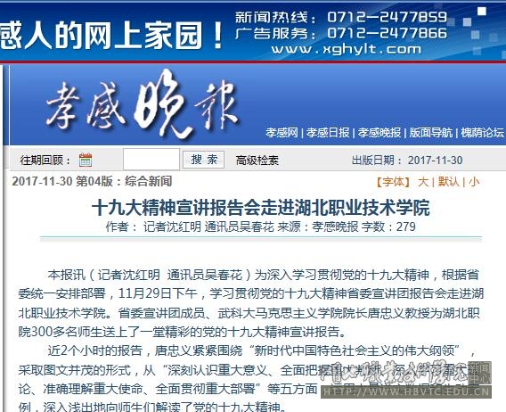 本报讯(记者沈红明 通讯员吴春花)为深入学习贯彻党的十九大精神,根据省委统一安排部署,11月29日下午,学习贯彻党的十九大精神省委宣讲团报告会走进虎牙手机客户端。省委宣讲团成员、武科大马克思主义学院院长唐忠义教授为湖北职院300多名师生送上了一堂精彩的党的十九大精神宣讲报告。