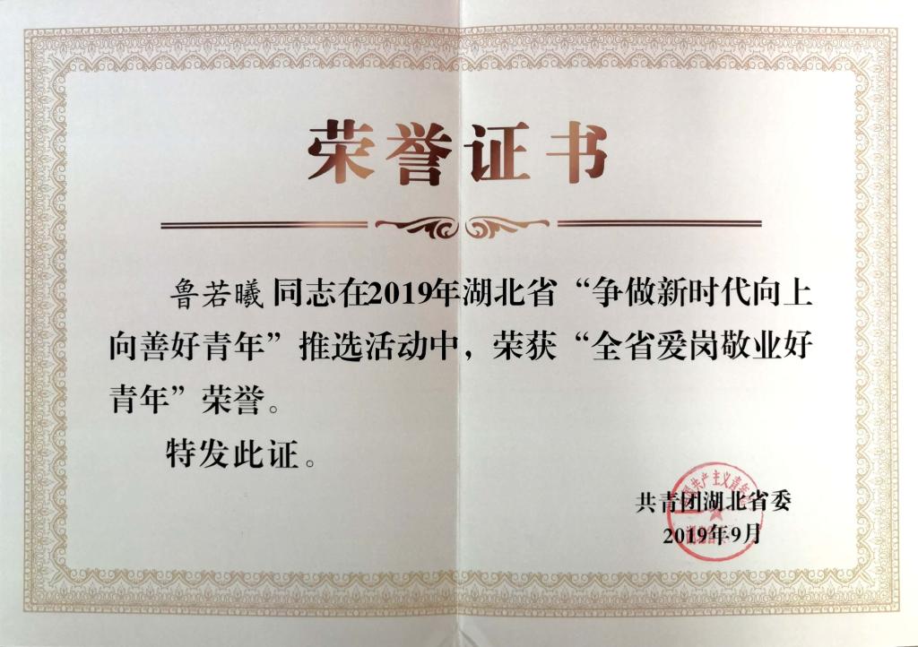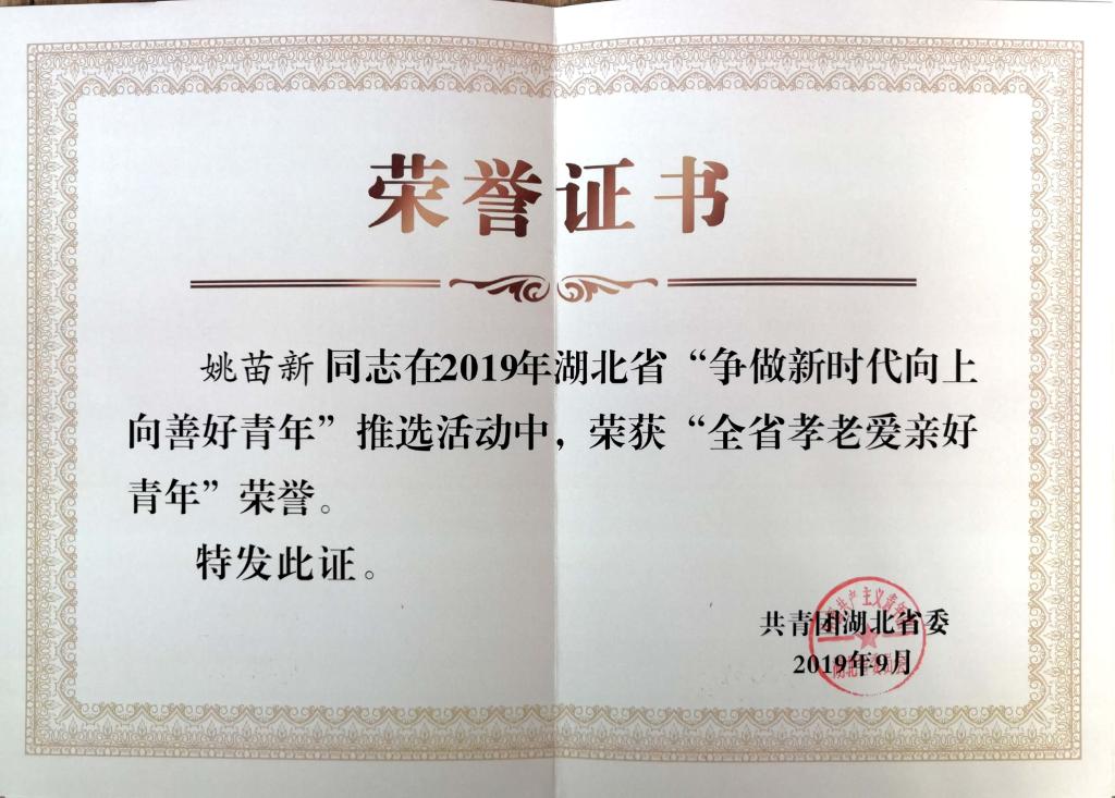 在新中国成立70周年来临之际,湖北省2019年“争做新时代向上向善好青年”推选活动结果揭晓,我校2名青年师生荣获“湖北省新时代向上向善好青年”荣誉。 其中,校团委教师鲁若曦获“爱岗敬业好青年”、护理学院2017级学生姚苗新获“孝老爱亲好青年”。