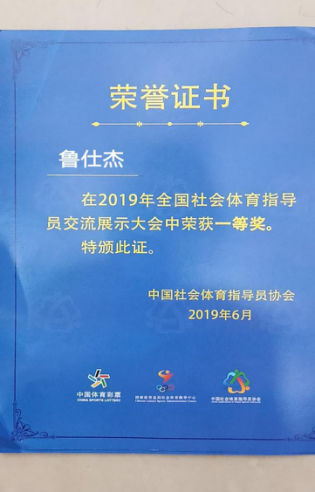 2018年1月参加国家一级社会体育指导员培训并获得“一级社会体育指导员证书”。