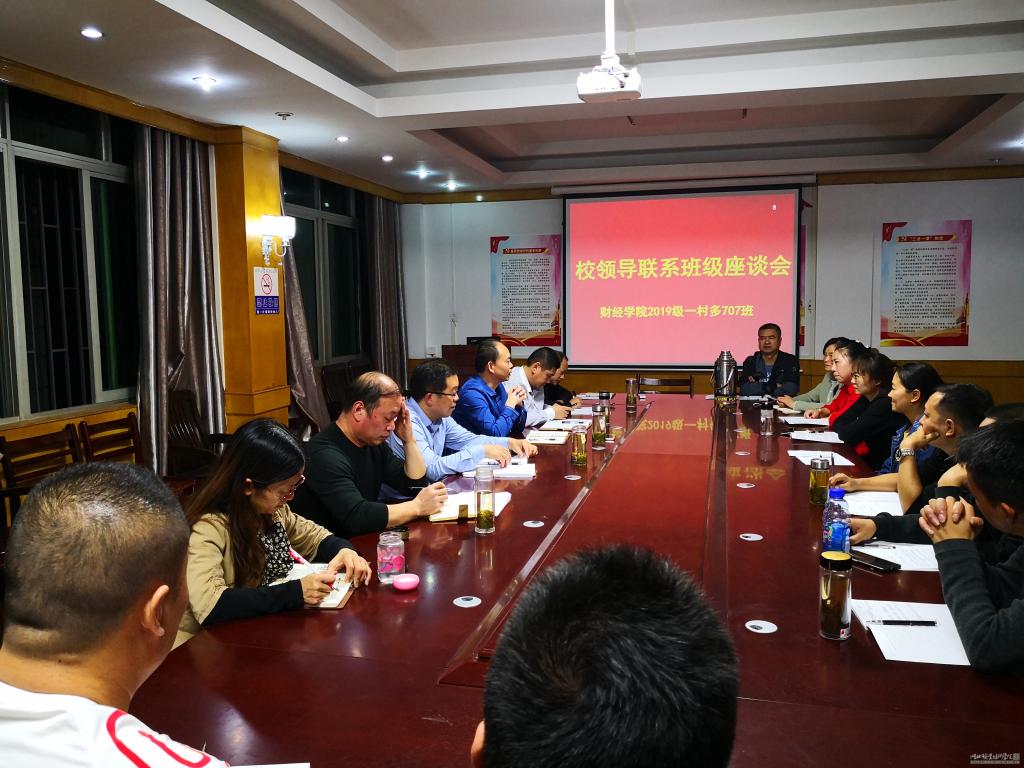 10月22日,是财经学院2019级一村多新生开课的第一天,为了切实了解一村多新生学习情况,帮助学员解决实际困难,结合“勿忘初心 牢记使命”主题教育活动的部署和要求,财经学院在文华楼二楼会议室召开2019级一村多电子商务707班校领导联系班级座谈会。副校长梅重、财经学院全体班子成员及部分教师代表,1904707班全体在校学生参加了座谈会。