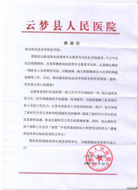 “他们虽然是实习生,但在疫情期间不怕困难,吃苦耐劳,为我院缓解了医务和行政人员的工作压力,让更多的医务人员投身到抗疫一线中……”3月22日,医学院收到了一封来自云梦县人民医院的感谢信,信中提到的青年志愿者突击队队员是医学院的两位实习生,分别是201703101班郎啟淳、201703303班的卢云中。