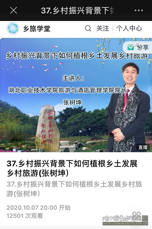 应位于浙江省湖州市的全国乡村旅游监测中心、世界乡村旅游大会机构邀请,我校旅游与酒店管理学院院长张树坤于10月7日晚20:00做客该中心主持的“乡旅学堂”网上教学平台,在乡村旅游面对面直播栏目讲授了题为“乡村振兴背景下如何植根乡土发展乡村旅游”的线上课程。在时长为35分钟的讲授结束后,张树坤还与全国各地的学员进行了10分钟的线上互动。至课程结束时,进入直播课堂的学员人数上升至12,500人,创乡旅学堂线上讲座开播以来新高。