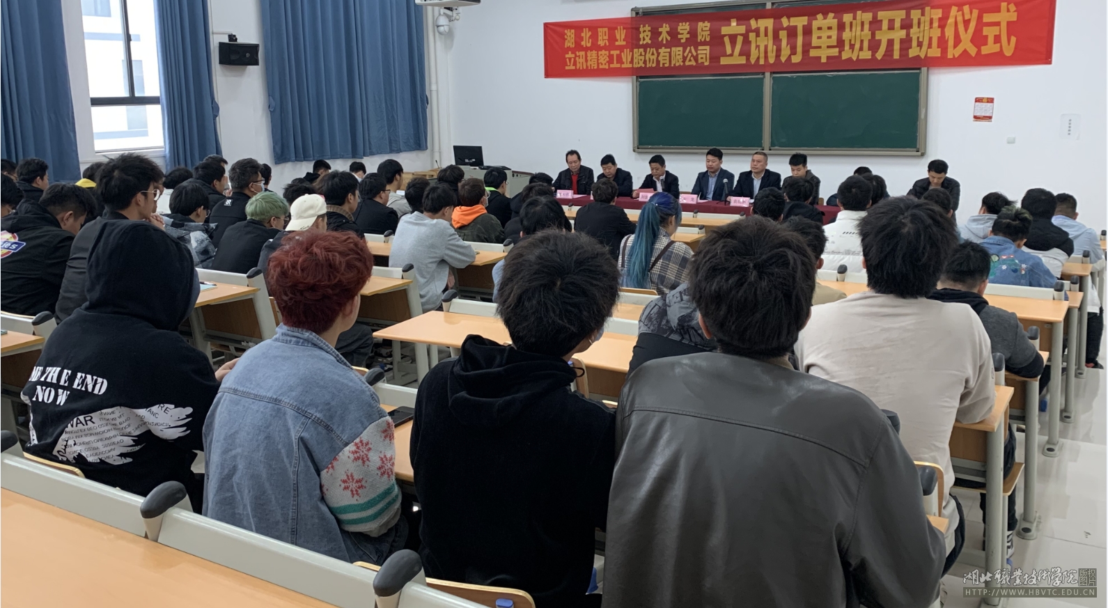 (本网通讯员:郭和伟 曹艺)阳春三月,春暖花开。3月26日,虎牙手机客户端与立讯精密工业股份有限公司“订单班” 开班仪式在南校区知行楼举行。立讯精密工业股份有限公司华东大区经理孟龙、招聘主管李丹青,学校教务处、校企合作处副处长王俊平、机电工程学院院长袁晓洲、副院长郭和伟、副书记邓小楚、教研室主任谢超明、立讯“订单班”2020级76名学生参加了开班仪式。机电工程学院书记刘新平主持开班仪式。