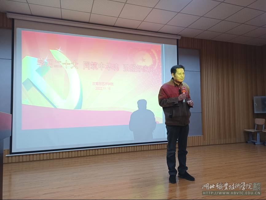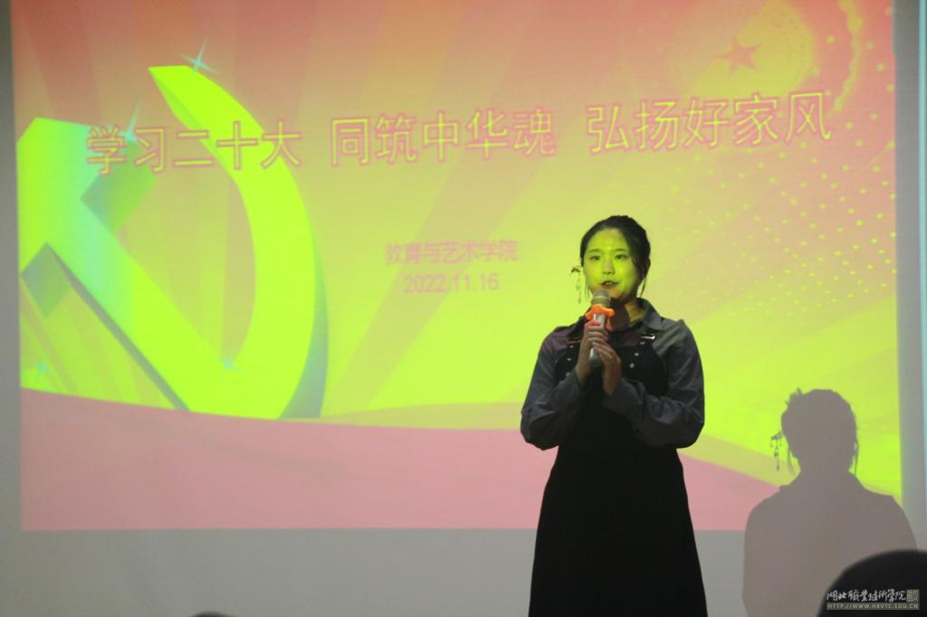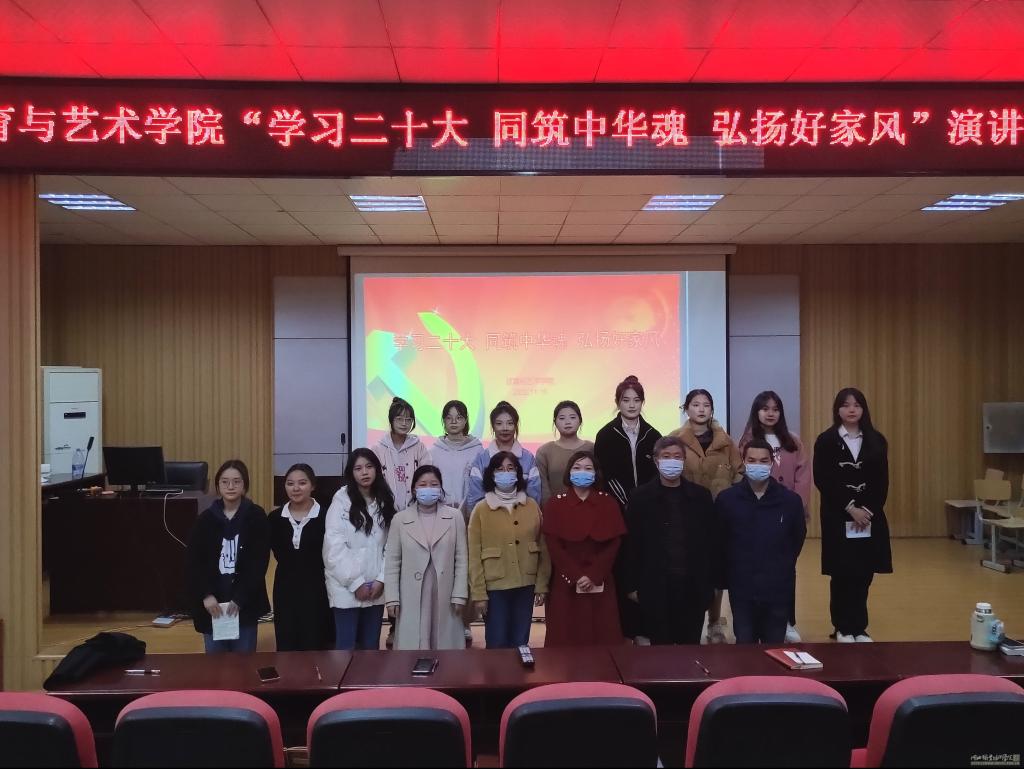 (本网讯 胡晨晨 谭畅 鲁启航)2022年11月16日晚19:00,教育与艺术学院“学习二十大 同筑中华魂 弘扬好家风”主题演讲比赛在师范校区办公楼501会议室举行,校关工委常红生主任、教育与艺术学院院长肖成林出席此次比赛,副院长张玮、副院长陈胜华、学工办赵荣华老师、周小军老师、余翠琴老师、王春老师、李璇老师担任评委。