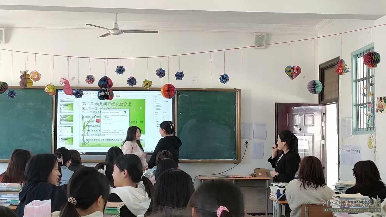 教研活动分为两个阶段。第一阶段由新进青年教师周雯在22010914班上公开课,授课内容是《幼儿园班级管理》之“幼儿园班级安全管理”。周老师以近些年一些幼儿园发生的安全事故的相关视频作为课堂导入,以非常直观的方式增强了学生对于班级安全管理重要性的认识。过程中,周雯老师带着学生一起梳理幼儿园室内外环境以及一日生活常规中的安全隐患及操作要点。为了增强学生的实操能力,在部分环节,直接请学生现场演练,既加强了学生的参与度,也在课程中贯彻了“以实操促技能提升”的教学理念。