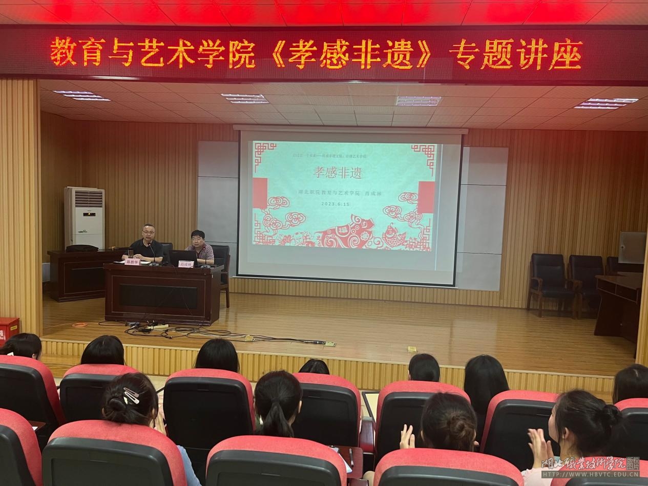(本网讯 黄兰 )每年6月的第二个星期六为世界文化遗产保护日。6月15日,教育与艺术学院在办公楼五楼报告厅举办《孝感非遗》专题讲座活动。讲座活动由肖成林院长主讲,陈胜华副院长主持。教育与艺术学院师生代表160余人参加了此次活动。