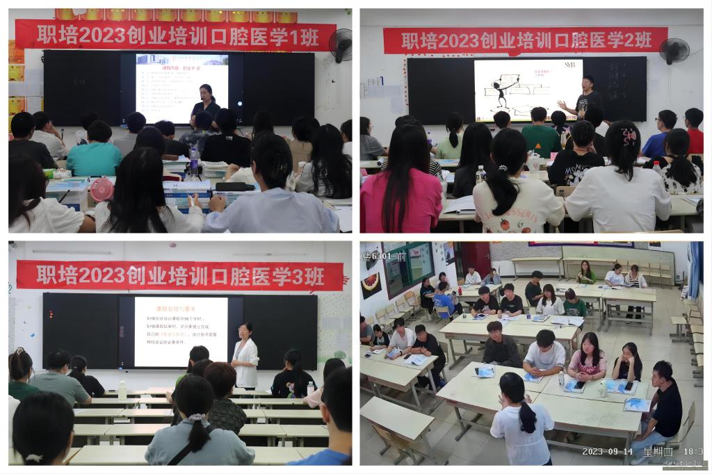 (本网讯 吴逸华) 9月14日,口腔医学院大学生创业培训班在东区德艺楼101教室、102教室、301教室顺利开班。本次创业培训班由孝感市人力资源和社会保障局主办,我校继续教育学院与口腔医学院共同承办,培训对象为2021级“3+2”专本联合培养口腔医学专业的67名学生。