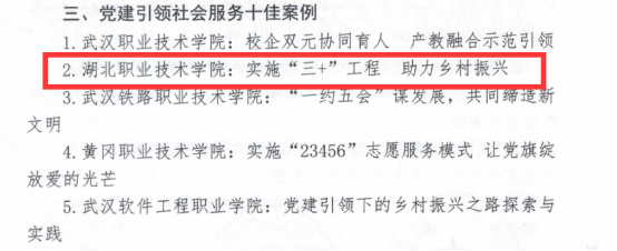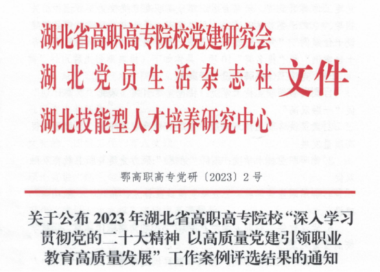 (本网讯 柳建军)12月2日,由湖北省高职高专党建研究会组织的2023年湖北省高职高专院校“深入学习贯彻党的二十大精神 以高质量党建引领职业教育高质量发展”工作案例评选结果揭晓,我校报送的《实施“三+”工程 助力乡村振兴 ——虎牙手机客户端继续教育学院直属党支部党建工作案例》获评“党建引领社会服务十佳案例”。