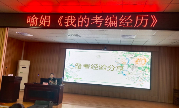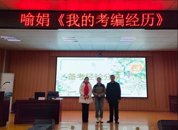 会上,喻娟用自己成功上岸的亲身经历,从教资备考、专升本备考、考编制备考三个方面进行了详细分享,把自己的备考成功经验毫无保留地分享给现场的学弟学妹,鼓励他们调整心态、优化复习方法、合理安排时间、科学运用技巧,为自己的青春着色、今后的发展奠定基础。