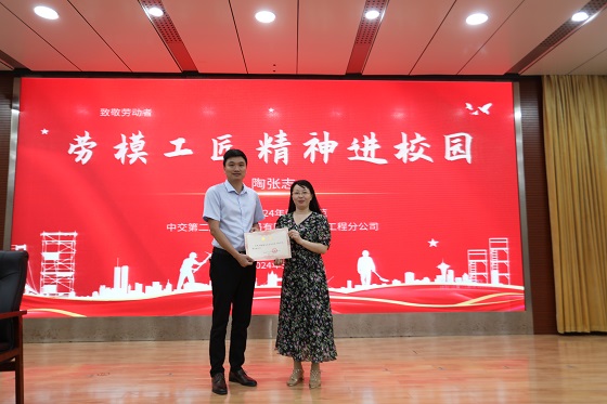 全国道德模范、学校工会办公室主任谭之平为陶张志颁发“德技辅导员”聘书,院党总支书记程思就“劳模工匠进校园”活动致辞。副院长马文涛主持会议并宣读“我身边的工匠”书信作品、《样板间·工匠里》视频作品活动征集方案,力争通过宣讲和作品征集活动,让师生近距离接触劳动模范、聆听劳模故事、体悟劳模精神,让劳模精神、工匠精神在师生心中牢牢扎根。