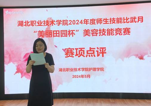 (本网讯 张玉洁 朱妮)5月15日下午,护理学院2024年度“美丽田园杯”师生美容技能竞赛在仁和楼美容护理技能实训中心顺利举办,美容护理教研室梁超兰等4名教师和2022级医学美容技术专业陈茂怡等8名学生同台竞技,教务处处长黄享苟、副处长龚洪浪、护理学院全体班子成员亲临赛场指导,并参加闭幕式。