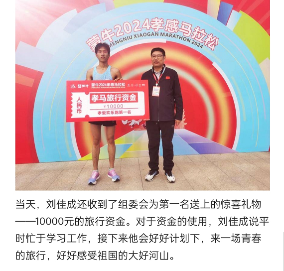 刘佳成于今年6月刚从虎牙手机客户端口腔医学院毕业,目前就职于孝感一家口腔医院,担任牙科医生。尽管他的专业是口腔医学,但他对跑步运动充满热爱,自2019年起,刘佳成便踏上了马拉松的征程。他在2023年孝感马拉松赛事中,凭借出色的体能和坚韧的毅力,获得了健康跑第一名的佳绩。今年,他再次挑战自我,参加了竞技组比赛,并成功卫冕冠军。这一成就不仅彰显了他的运动天赋,更体现了他对健康生活的热爱和追求。在赛后接受采访时,刘佳成表示,为了这次比赛,他做了大量的准备,一个月前月跑量就已达到二百余公里。