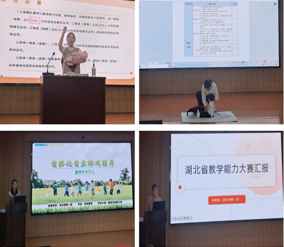 教师赛展示环节中,张卓老师(一带一路金砖国家首届0 - 1岁婴儿回应性照护国赛)和王叶老师(金砖国家第二届幼儿照护赛区域赛),不仅分享了他们在备赛与参赛过程中的宝贵经验和深刻感悟,更是别出心裁地现场模拟了大赛的激烈角逐,每一个细节都扣人心弦。涂琳、朱萌萌老师详尽解析了湖北省教师教学能力大赛赛制要求和备赛过程。每位汇报人将大赛的精华与亮点一一呈现,赢得台下阵阵掌声。她们的讲解对于年轻老师们而言,无疑是一场及时雨,为她们今后参与此类大赛指明了清晰的方向。