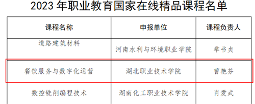 (本网讯 马江浩) 近期,教育部公布了2023年职业教育国家在线精品课程名单,财经与旅游学院曹艳芬教授带领团队打造的《餐饮服务与数字化运营》课程榜上有名,成功入选2023年职业教育国家在线精品课程。