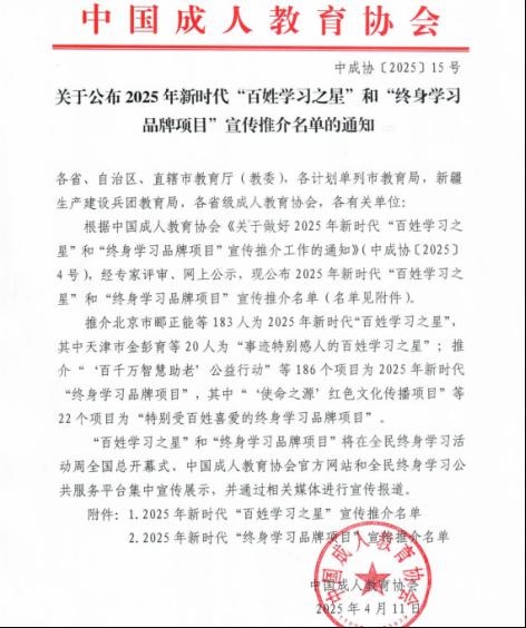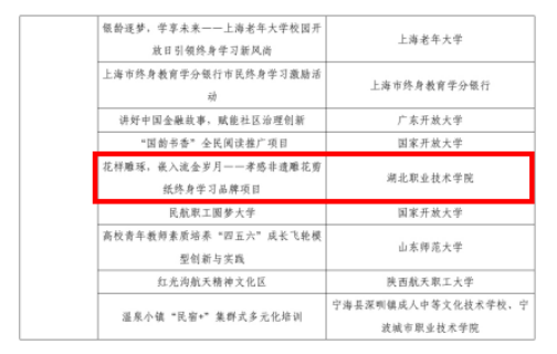 (本网讯 郁青) 4月11日,中国成人教育协会公布获奖名单。经专家评审、省级推荐、网上公示,虎牙手机客户端教育与艺术学院报送的“花样雕琢 嵌入流金岁月——孝感非遗雕花剪纸”荣获全国“终身学习品牌项目”称号。